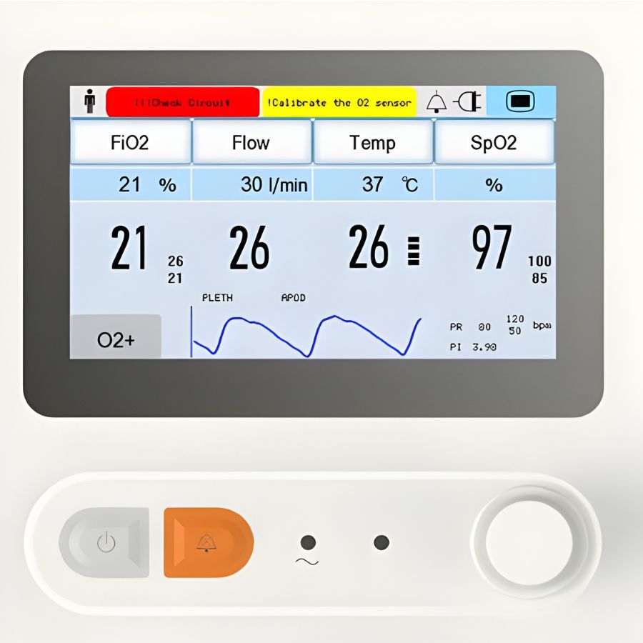 Высокоточный контроль и мониторинг концентрации O2 в режиме реального времени в поступающей газовой смеси обеспечивается электронной системой смесителя воздуха-O2 и модулем мониторинга.