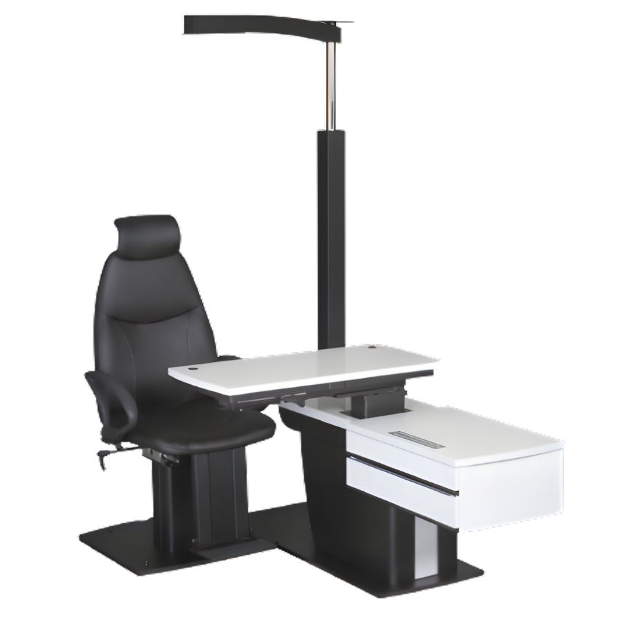 Рабочее место на два прибора со столешницей типа «слайдер». Колонна с лампой и стойкой для проектора знаков. Встроенный адаптер питания для щелевой лампы. Розетка 230V для дополнительного оборудования. Встроенный шкафчик с ящиком для набора пробных линз и один дополнительный ящик. Адаптер для подбородника.